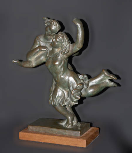 Two girls in simultaneous motion gaze adoringly at each other. Their flowing hair, ruffled skirts and fulsome limbs touch. The rhythmic sculpture melds their bodies into one.